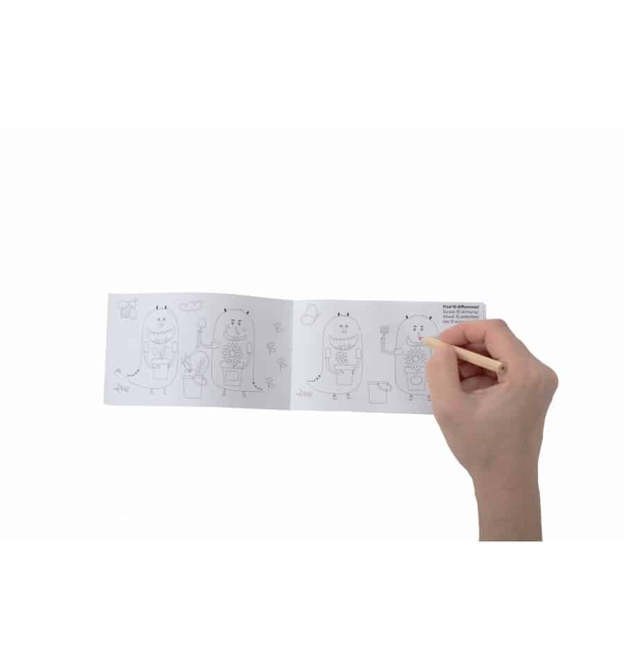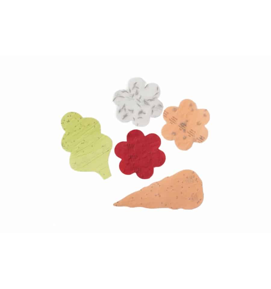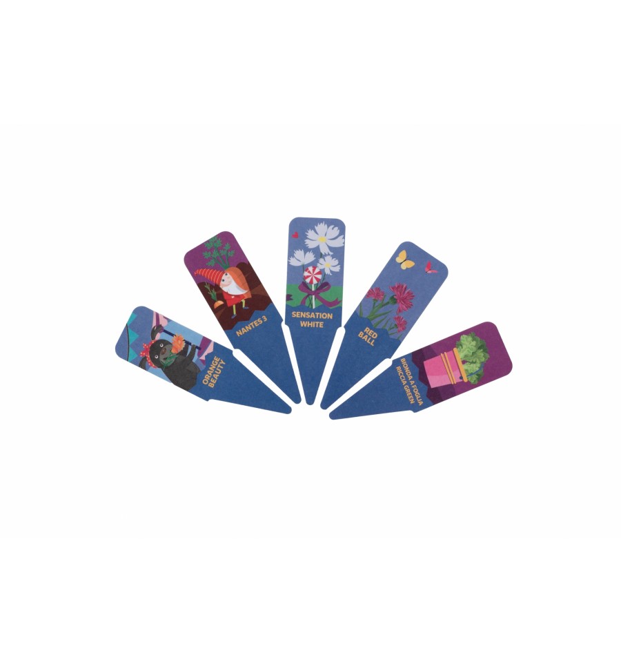 A készlet tartalma: Magok különböző formájú szőnyegeken 5 db (sárgarépa, saláta, körömvirág, búzavirág, kerti kozmosz), papírcímkék 5 db, színes ceruzák, kifestőkönyv.