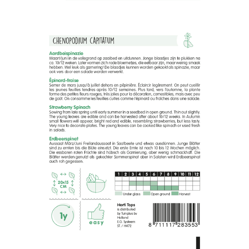 Vetés késő tavasztól nyár elejéig, szabadföldi magágyba. Kissé vékonyítsuk el. A fiatal levelek ehetők, és körülbelül 10/12 hét múlva betakaríthatók. Ősszel kis virágok jelennek meg, élénkvörösek és ehetőek, eperhez hasonlítanak, de kevésbé ízletesek. Nagyon szép a tányérok díszítése. A fiatal levelek a spenóthoz hasonlóan főzhetők, vagy frissen salátákhoz is felhasználhatók.