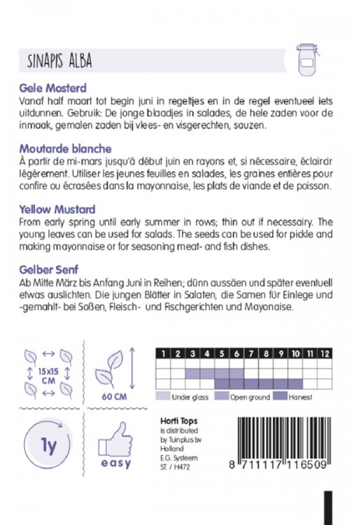 Sárga mustár Kora tavasztól kora nyárig sorokban; hígítsuk, ha szükséges. A fiatal levelek salátákhoz használhatók. A magvakat pácoláshoz, majonéz készítéshez, hús- és halételek fűszerezéséhez használhatjuk.