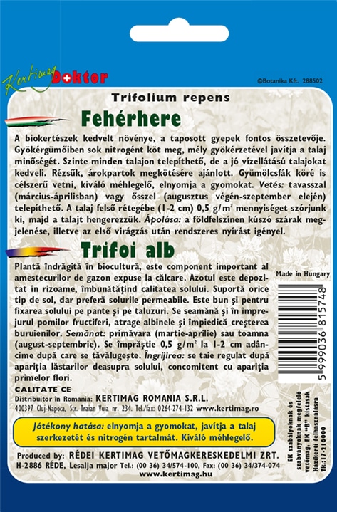 A biokertészek kedvelt növénye, a taposott gyepek fontos összetevője. Gyökérgümőiben sok nitrogént köt meg, mély gyökérzetével javítja a talaj minőségét. Szinte minden talajon telepíthető, de a jó vízellátású talajokat kedveli. Rézsűk, árokpartok megkötésére ajánlott. Gyümölcsfák köré is célszerű vetni, kiváló méhlegelő, elnyomja a gyomokat. Vetés: tavasszal (március-áprilisban) vagy ősszel (augusztus végén-szeptember elején) telepíthető. A talaj felső rétegébe (1-2 cm) 0,5 g/m² mennyiséget szórjunk ki, majd a talajt hengerezzük. Ápolása: a földfelszínen kúszó szárak meg- jelenése, illetve az első virágzás után rendszeres nyírást igényel.