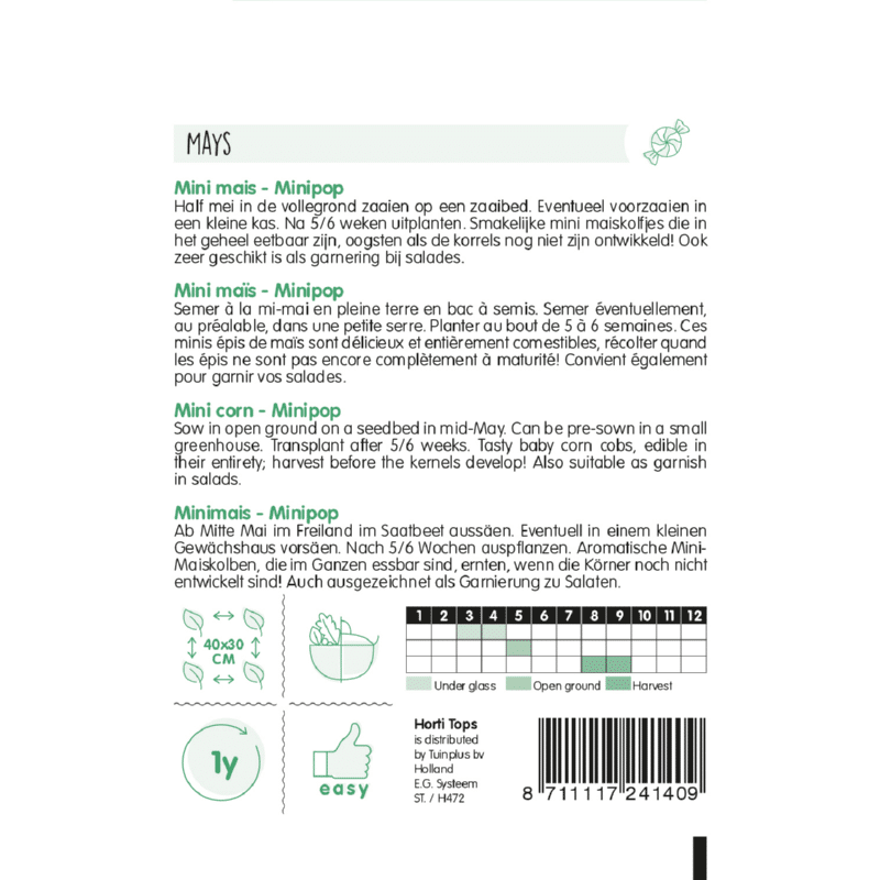 Május közepén vessük el a szabadföldön magágyba. Ha szükséges, elővetet egy kis üvegházban. 5/6 hét után ültesse ki. Ízletes mini kukoricacsövek, amelyek teljes egészében ehetőek, szüreteljetek, amikor a szemek még nem fejlődtek ki! Szintén nagyon