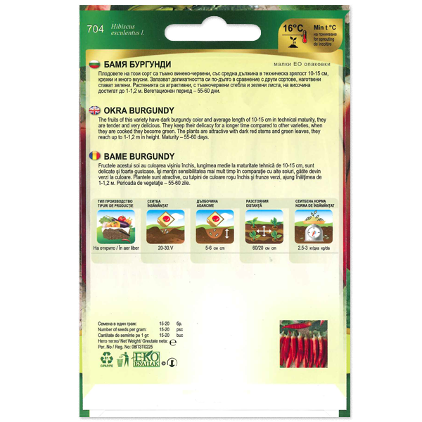 Vetésidő: május 20-30., 5-6 cm mélységben és 60 cm sorközi és 20 cm-es növények között.