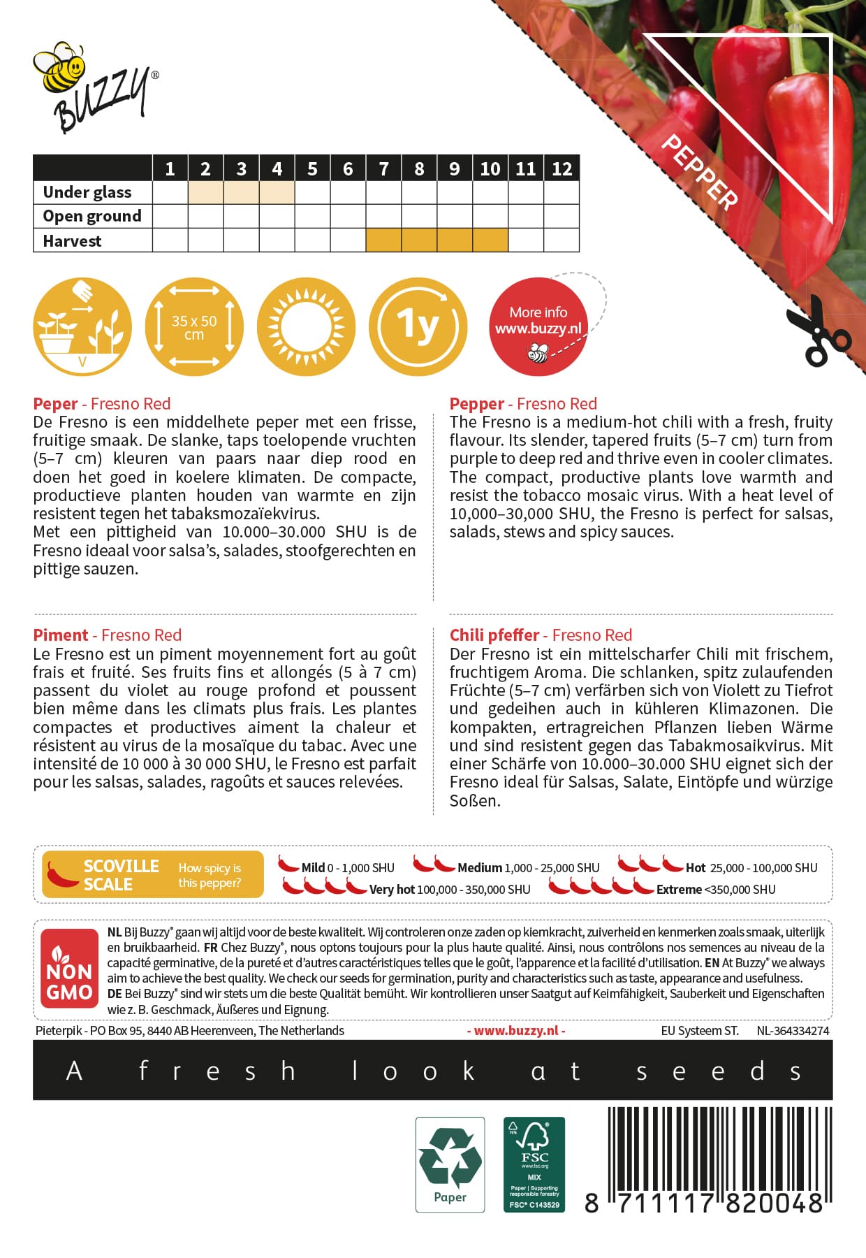 A Fresno egy közepesen csípős chili friss, gyümölcsös ízzel. Karcsú, kúpos termései (5–7 cm) liláról mélyvörösre változnak, és még hűvösebb éghajlaton is jól érzik magukat. A kompakt, termékeny növények szeretik a meleget, és ellenállnak a dohánymozaik vírusnak.