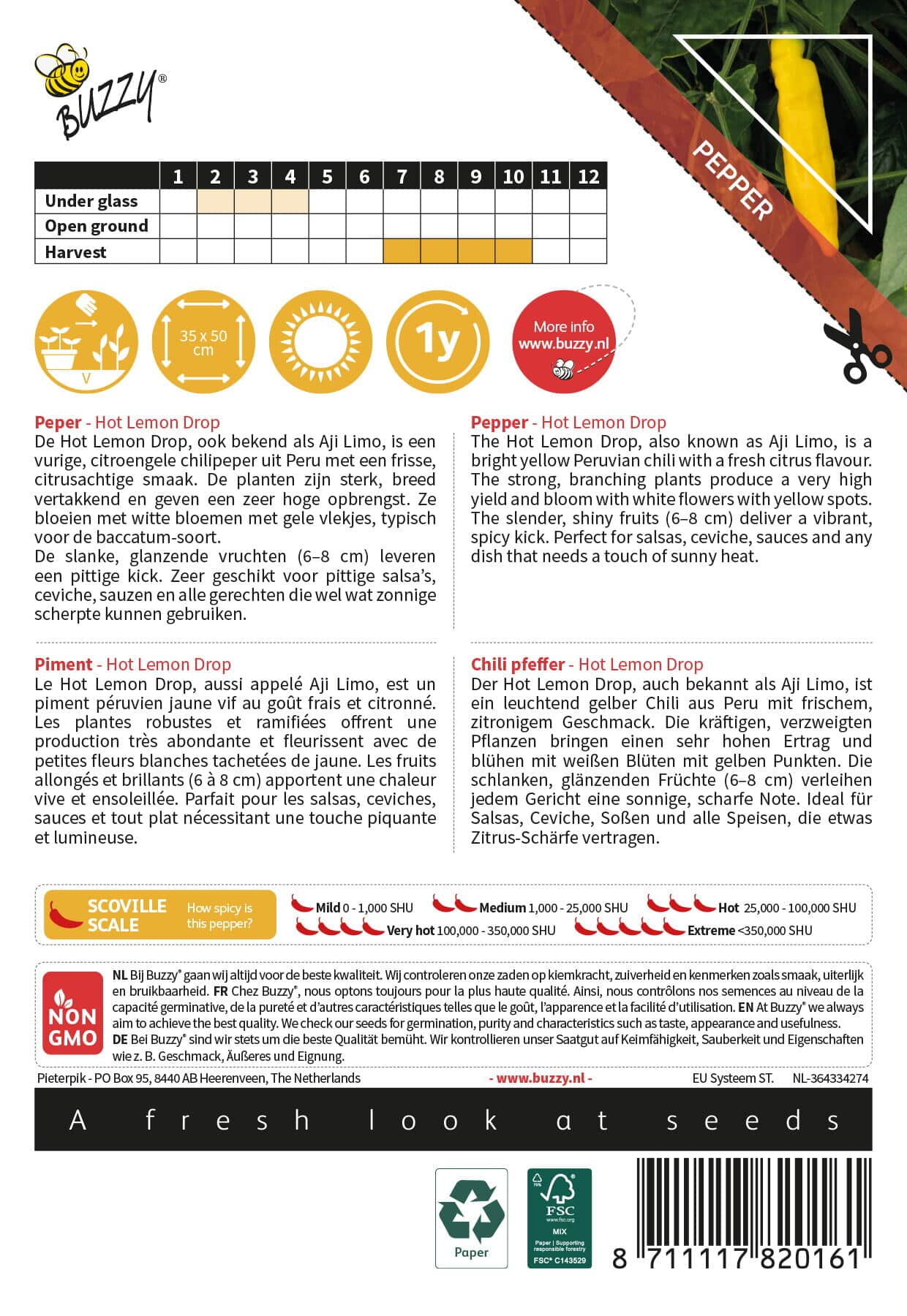 A Csípős citromcsepp, más néven Aji Limo, egy élénk sárga perui chili friss citrusos ízzel. Az erős, elágazó növények nagyon magas terméshozamot biztosítanak, és fehér, sárga foltos virágokkal virágoznak.