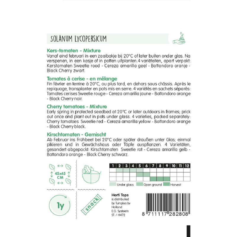4 fajta, külön csomagolva: Cseresznyeparadicsom Sweetie red – Cereza amarilla sárga – Bottondoro narancs – Fekete Cseresznye fekete.