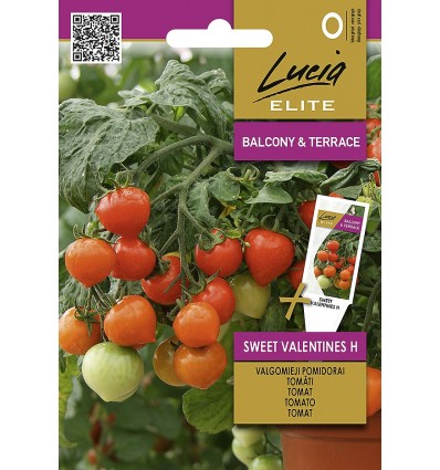 TOMATO SWEET VALENTINES H Korai, törpe, 30-35 cm magas, kivételes hibrid fajta, amely szív alakú paradicsomot terem. Jól növekszik cserépben – azon kevés fajták egyike, amelyek nem igényelnek nagy cserepet. A paradicsom kicsi, 15 g súlyú, nagyon ízletes, egy növényben 60-75 paradicsom is nehezedhet. A magokat márciusban vetik el. Annak érdekében, hogy gyorsabban és egyenletesebben csírázhassanak, üveggel vagy fóliával kell lefedni. Az aljzat hőmérséklete, amelybe a magokat veti, nem lehet alacsonyabb +21–26 °C-nál, a helyiség hőmérséklete nem lehet +23 °C-nál alacsonyabb. 2-4 valódi levél felnevelése után a palántákat külön ültetik át. A palántákat akkor ültetik az üvegházba, amikor már nem áll fenn a fagyveszély. 3-4 m²-es területre vagy 5-6 cserépre 7 mag elegendő.