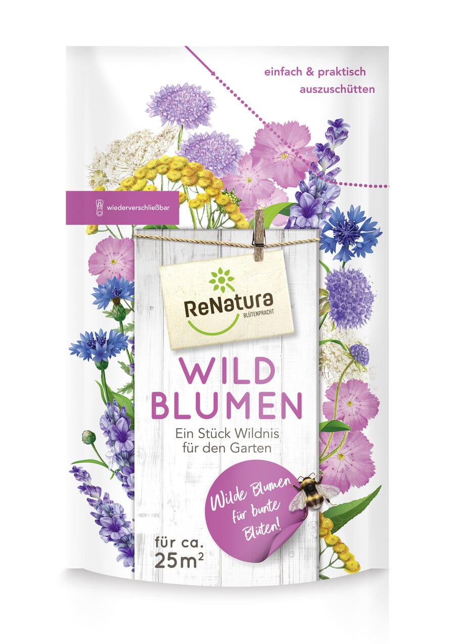 A ReNatura® vadvirágkeverék egy darabka színes vadont hoz a kertbe. Ez a sokoldalú keverék minden helyszínre alkalmas, és különösen jól fejlődik napos, nem túl nedves talajon. A színes virágok bősége vonzza a hasznos rovarokat, élőhelyet és változatos táplálékforrást biztosít számukra. A fajok sokféleségének köszönhetően a vadvirágok kora nyártól késő őszig virágoznak. A vadvirágkeverék egynyári és évelő fajokat is tartalmaz, így egyes fajok a vetés utáni évben is virágoznak. Néhány egynyári faj általában újra magot vet, így a következő néhány évben újra nő az adott területen. Ha a fajok sokfélesége ennek ellenére csökkenne, a ReNatura® Blumennachsaat (felülvetett virágkeverék) újravetésével ismét növelhető.