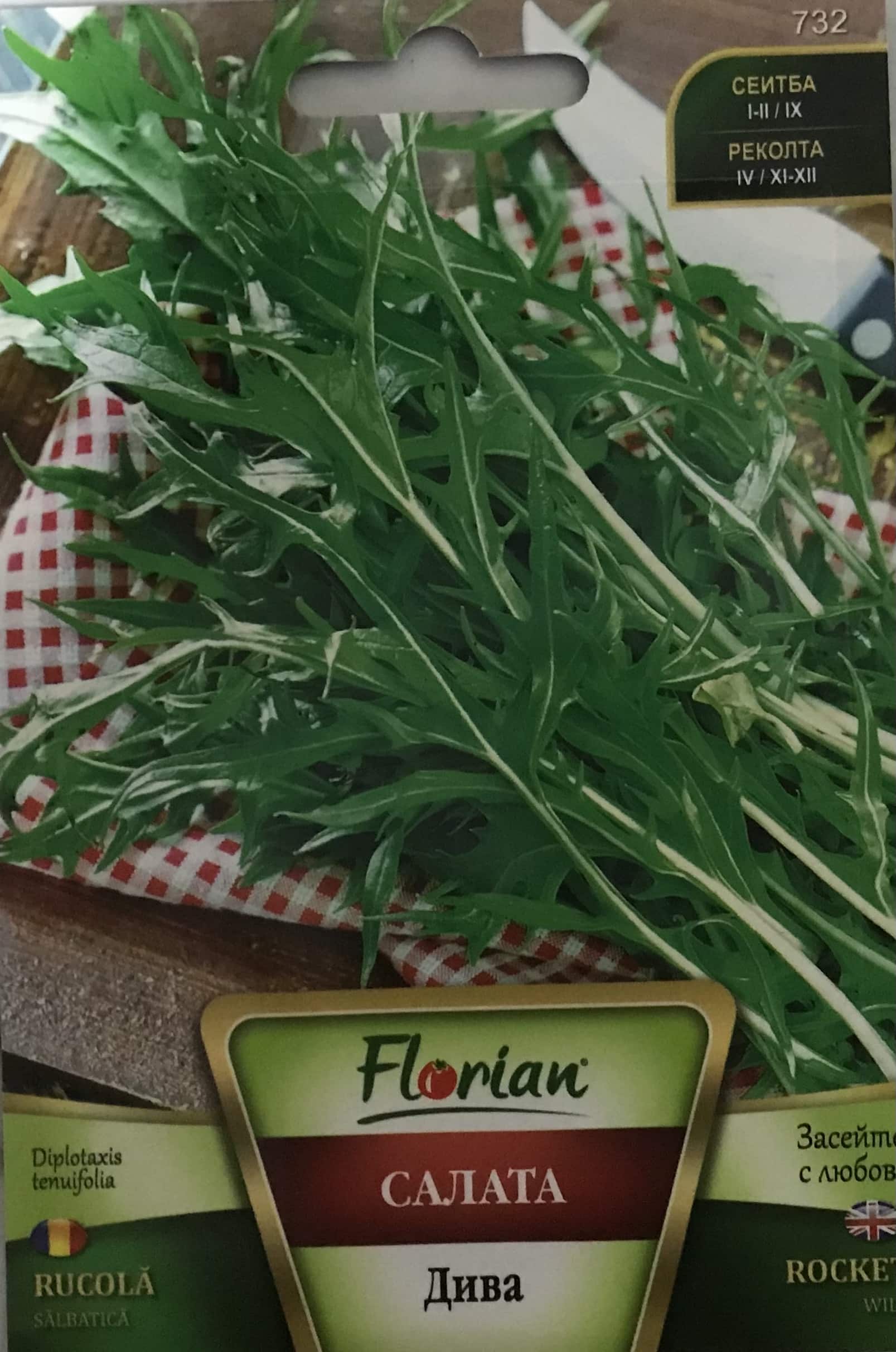 A vadon termő rukkola levelei sötétzöldek és nagyon csipkések, aromájuk erősebb, mint a kerti rukkoláé.Egyéves növény, akár 60 cm magas. Levelei húsosak, sajátos aromájúak, magas C-vitamin- és káliumtartalommal. Saláták és szószok készítésére használják, mindazonáltal keserűek és fűszeresek, a mogyoróhoz hasonló olajos ízűek. Minél fiatalabbak, annál gyengébb a keserű és fűszeres íz. A talajt az időszak alatt nedvesen kell tartani. Virágcserépben is termeszthető Vegetációs időszak télen 5-6 hét, nyáron 4 hét.