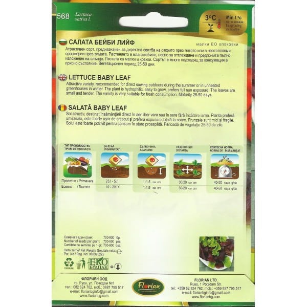 A Baby Leaf saláta egy kis levelű fajta, kiválóan alkalmas friss fogyasztásra. Vonzó fajta, nyáron közvetlenül a szabadban, télen pedig fûtés nélküli védett helyen termeszthetõ, a növény kedveli a nedvességet, nagyon könnyen termeszthetõ, és jobban szereti a teljes napsugárzást. A levelek kicsinek és törékenynek hangzanak. A vegetációs időszak 25-50 nap.