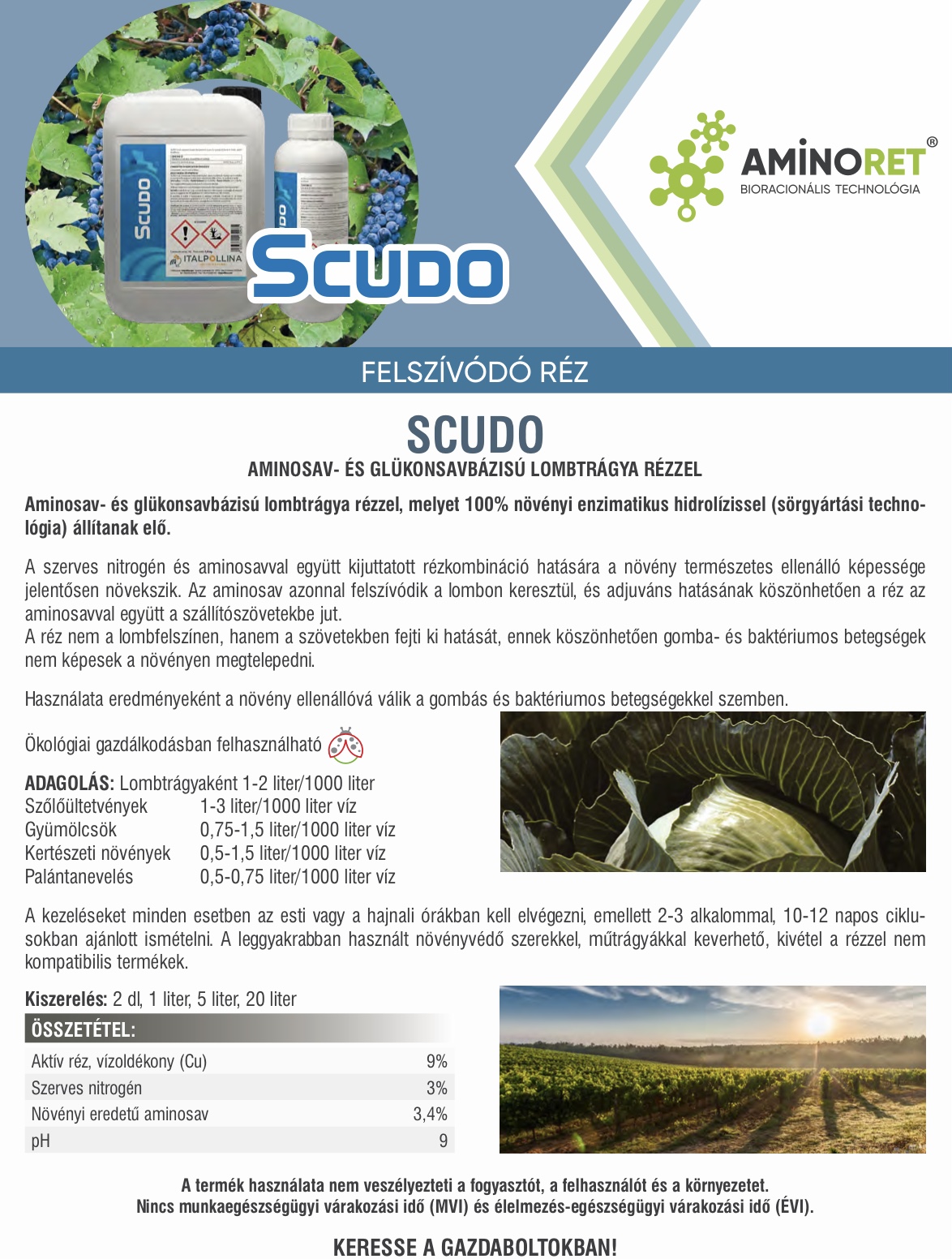 Különleges, aminosav- és glükózsavbázisú lombtrágya aktívréz- (9% Cu) és aminosav- (3,4%) tartalommal. 100% növényi enzimatikus hidrolízissel (sörgyártási technológia) állítják elő.