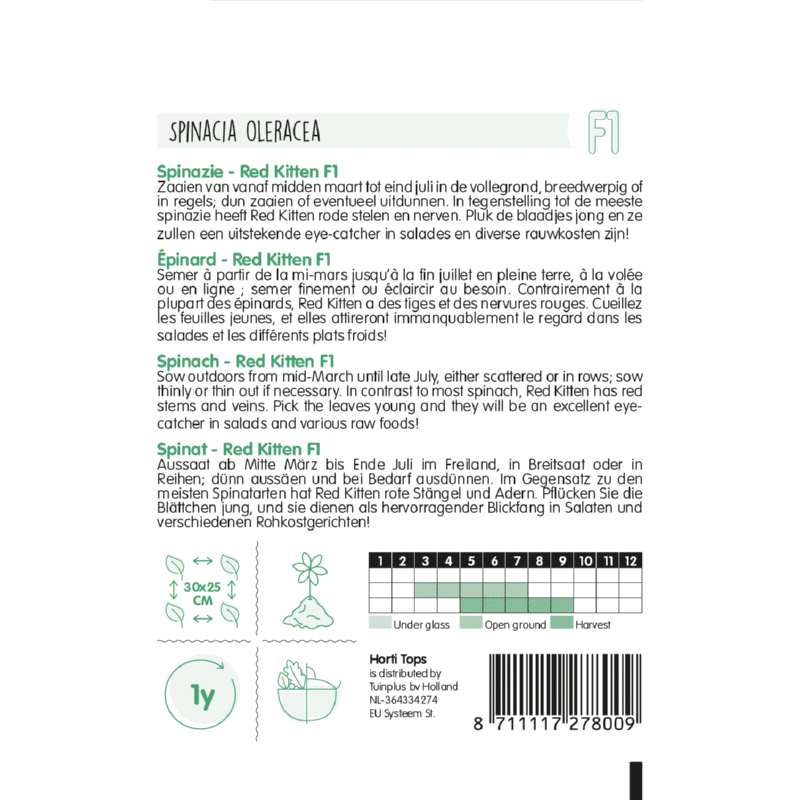 Március közepétől július végéig szabad a szabadba vetni, akár elszórtan, akár sorokban; vékonyan vagy hígítsuk, ha szükséges. A legtöbb spenóttal ellentétben a Red Kittennek pirosak a szárak és erek. Szedd fiatalon a leveleket, és salátákban és különféle nyers ételekben kiváló szemrevaló lesz!