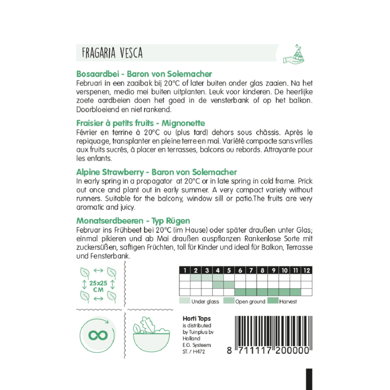 Kora tavasszal szaporítóban 20°C-on vagy késő tavasszal hideg keretben. Szúrjuk ki egyszer, és nyár elején ültessük ki. Nagyon kompakt fajta futók nélkül. Alkalmas erkélyre, ablakpárkányra vagy teraszra. A gyümölcsök nagyon illatosak és lédúsak.