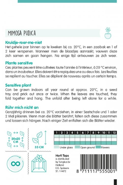 Érzékeny növény Beltérben egész évben termeszthető kb. 20°C-on, egy magtálcába, és egyszer-kétszer szúrjuk ki. Amikor a leveleket megérintik, összehajtják és lelógnak. Kibontakozik azután, hogy egy ideig nem érintjük.