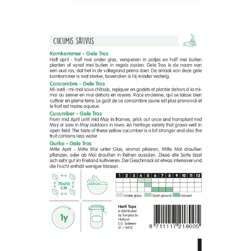 Április közepétől május közepéig keretben, egyszer szúrjuk ki és május közepén ültessük át, vagy májusban vessük a szabadba sorokba. Örökségi fajta, amely jól terem szabadföldön. Ennek a sárga uborkának az íze valamivel erősebb, és a gyümölcsök is kevesebb vizet tartalmaznak.