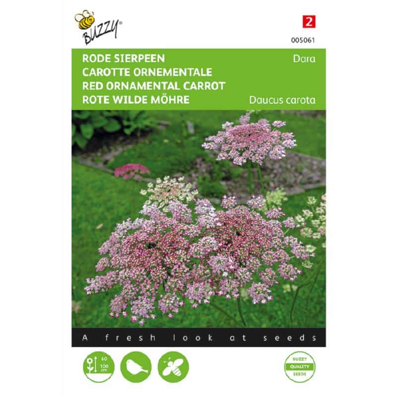 A Daucus carota Dara a vad, fehér díszes sárgarépa vörös változata, amely Hollandiában mindenhol előfordul a természetben. Ez a kétéves, ernyőszerű virágokkal rendelkező növény madárfészekre emlékeztet, és a világos rózsaszíntől a padlizsánig változó árnyalatú. És ezért ezt a piros díszes sárgarépát „lila puszinak” is nevezik.